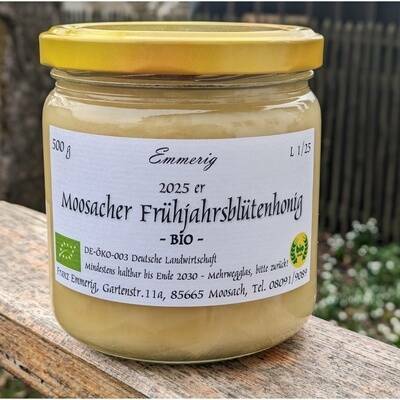 Frühjahrsblütenhonig - der süßeste Honig! Die Bienen tragen dafür vor allem den Nektar von den Blüten der Apfelbäume und vom Löwenzahn ein. Jedes Jahr schmeckt er wieder ein bisschen anders. Feinsteif-cremig.